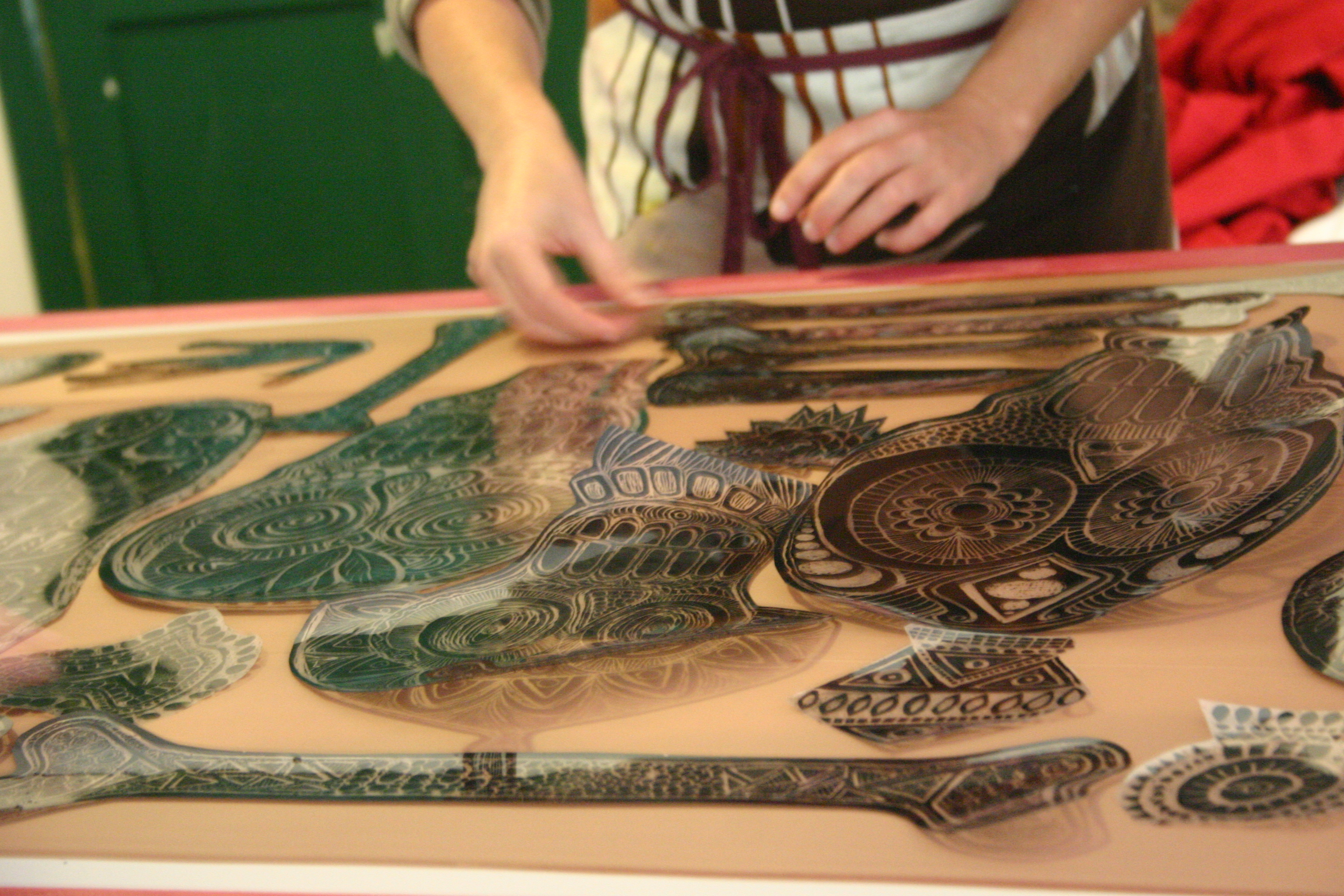 Ingrid and Rhonda screenprinting the big feathers
