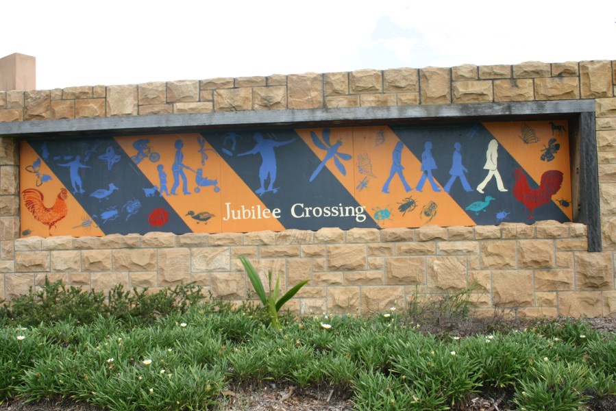 Jubilee Crossing entranceway mural designed by Nancy Brown and Forest Lake SHS students